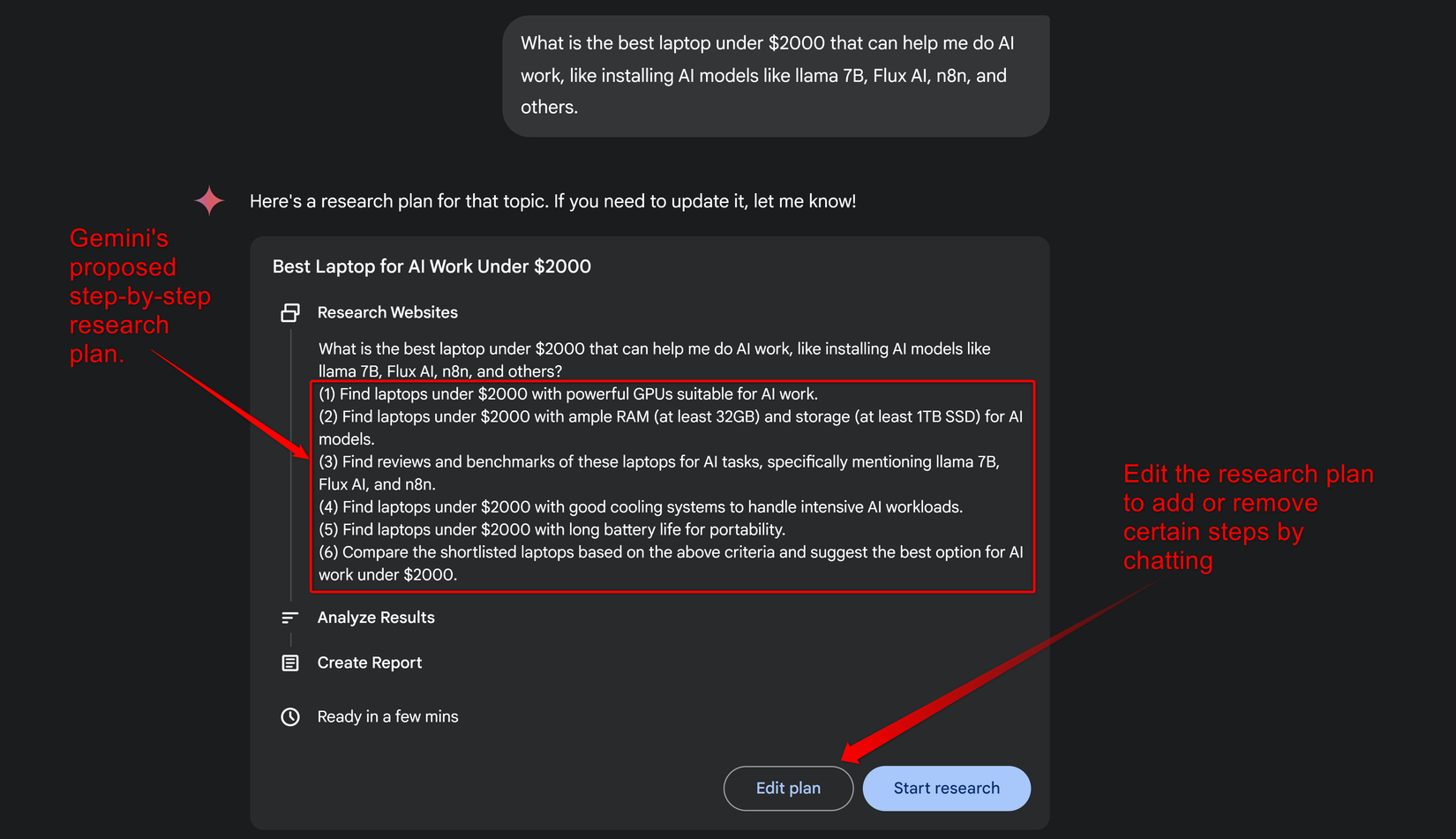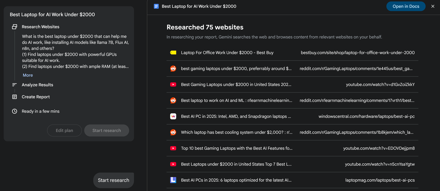 จะเป็นฟังก์ชันที่ใกล้เคียงกับคำว่า Agentic Ai คือการที่ Ai สามารถเรียนรู้ได้ด้วยตัวเองได้ โดยพอเราทำการใส่ Prompt เข้าไปในตัวของ Ai เเล้วมันจะทำการคิด เเละคิดเเพลนมาให้เราก่อนว่าตอนนี้ Ai จะทำการ Research อะไรบ้าง พอทำเสร็จเเล้ว ก็จะทำการ Combine เเละ Analyse ออกมา พอเสร็จก็ทำเป็น Report ให้กับเรา ซึ่งเราก็สามารถที่จะเเก้ ตัวเเพลนที่ Ai สร้างมาได้เพื่อทำให้ได้ผลลัพท์ตามที่เราต้องการ